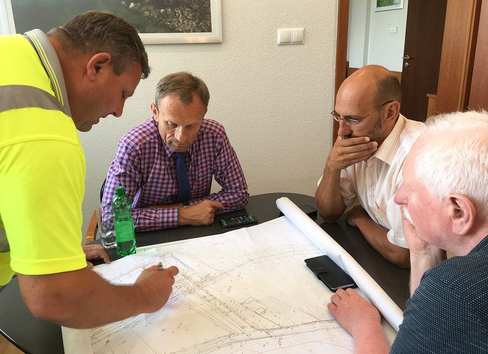 Jerzy Kwiatek, Dyrektor Zakładu Miedzianka prezentuje możliwości wykonania przepięcia linii wodociągu do ujęcia wody z Lesicy. Od lewej: Jerzy Kwiatek, Nordkalk; Zbigniew Piątek, Wójt Gminy Piekoszów; Marcin Heliosz, Prezes ZUK Piekoszów, Andrzej Jabłoński, Dyrektor Produkcji Nordkalk CE.