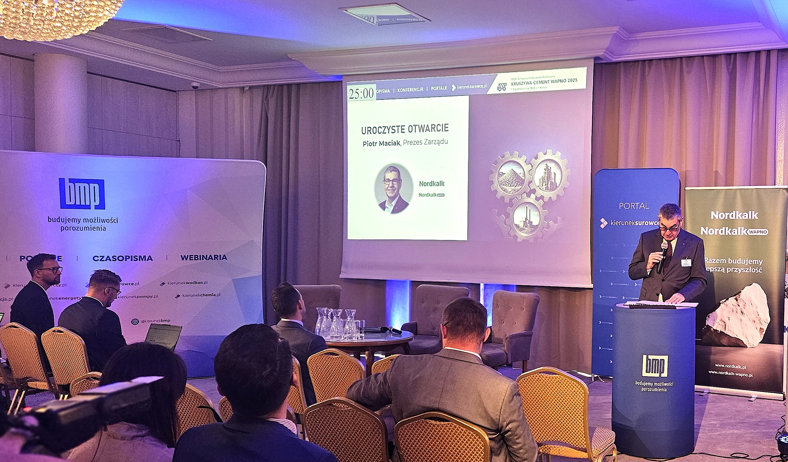 Konferencję otworzył Prezes Zarządu Nordkalk, Piotr Maciak, który przywitał uczestników w sercu regionu świętokrzyskiego — terenie z tradycją górniczą. Podczas wystąpienia zaznaczył, że branża wapiennicza i surowców budowlanych to fundament wielu gałęzi gospodarki: budownictwa, hutnictwa, rolnictwa, energetyki. Wapno i kruszywa, jego zdaniem, to surowce umożliwiające m.in. utrzymanie czystego powietrza, jakości gleby i równowagi środowiskowej.