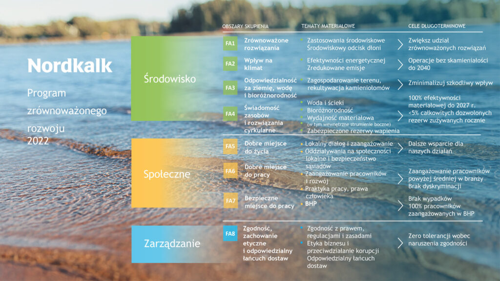 Działania Nordkalk prowadzone są na podstawie Programu Zrównoważonego Rozwoju. Jego ważnym elementem są oczekiwania interesariuszy, przy jednoczesnym uwzględnieniu perspektywy środowiskowej, społecznej i ekonomicznej. Program Zrównoważonego Rozwoju jest podzielony na osiem obszarów tematycznych i składa się z osiemnastu istotnych aspektów. Każdy obszar zawiera dedykowane zobowiązania, cele długoterminowe oraz Kluczowe Wskaźniki Efektywności (KPI). Strategia działania Nordkalk jest zgodna z Celami Zrównoważonego Rozwoju ONZ (2030).